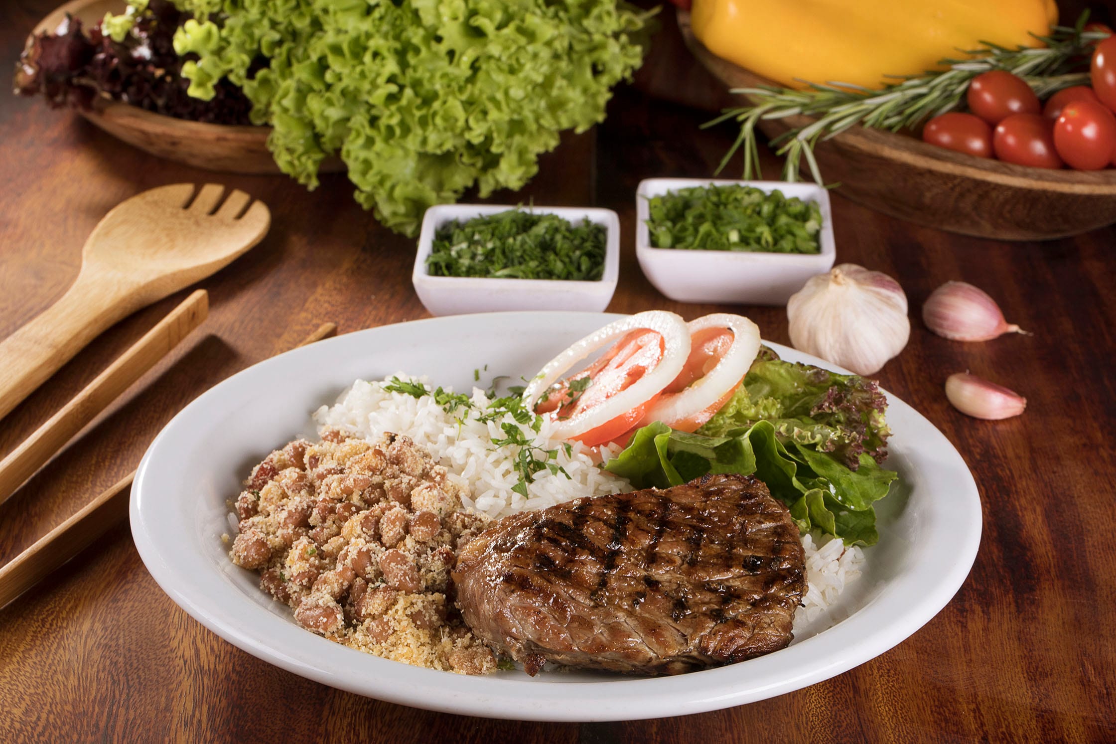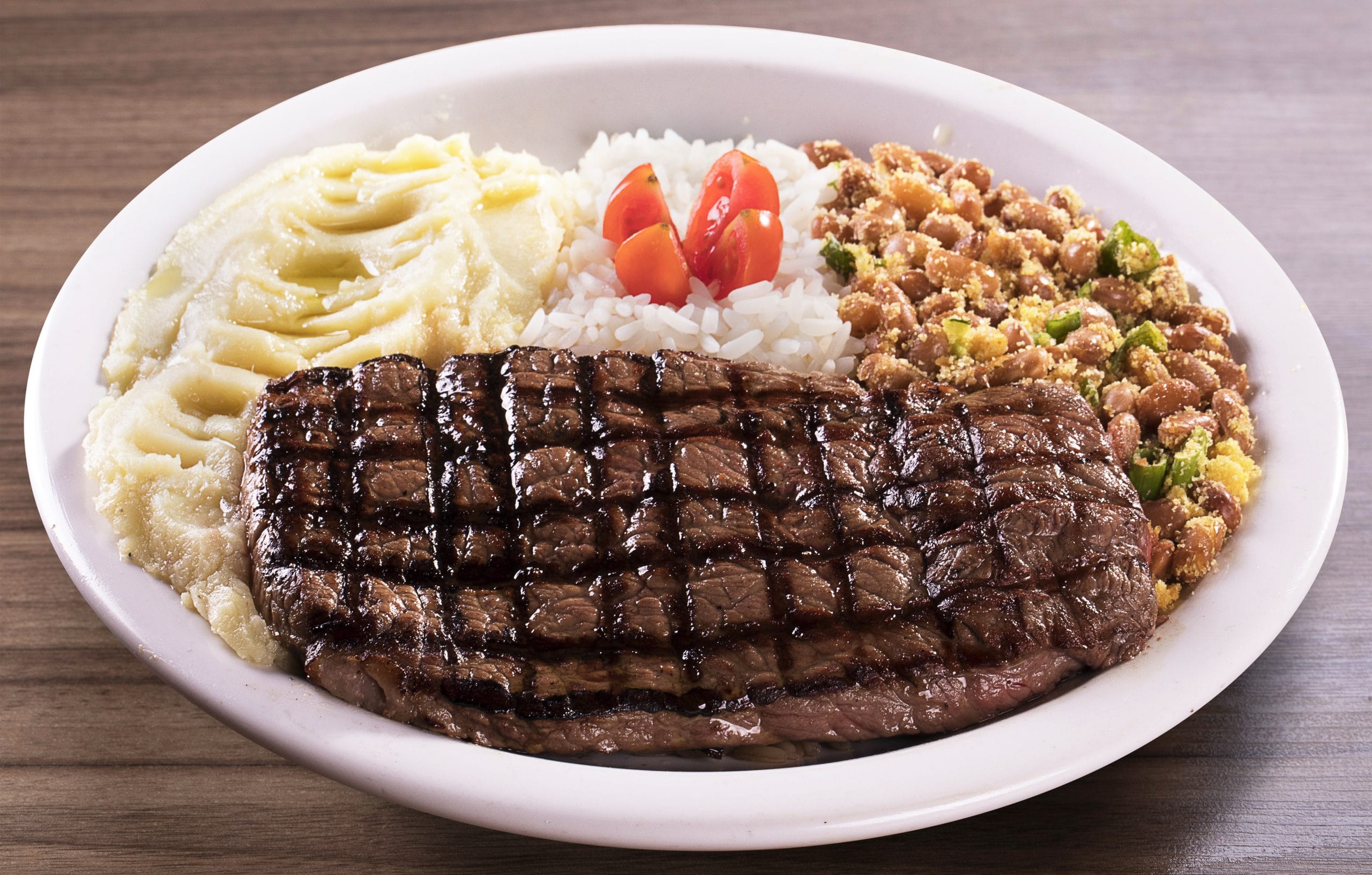 Corte retirado do coxão mole, aplicado o tempero Sal e Brasa e grelhado no char broiler. Servido com um ovo frito em cima.