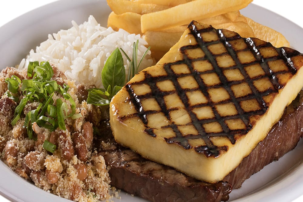 Corte retirado do coxão mole, maturado com sal por 12 horas, grelhado no char broiler, servido com uma fatia de queijo coalho grelhado por cima.