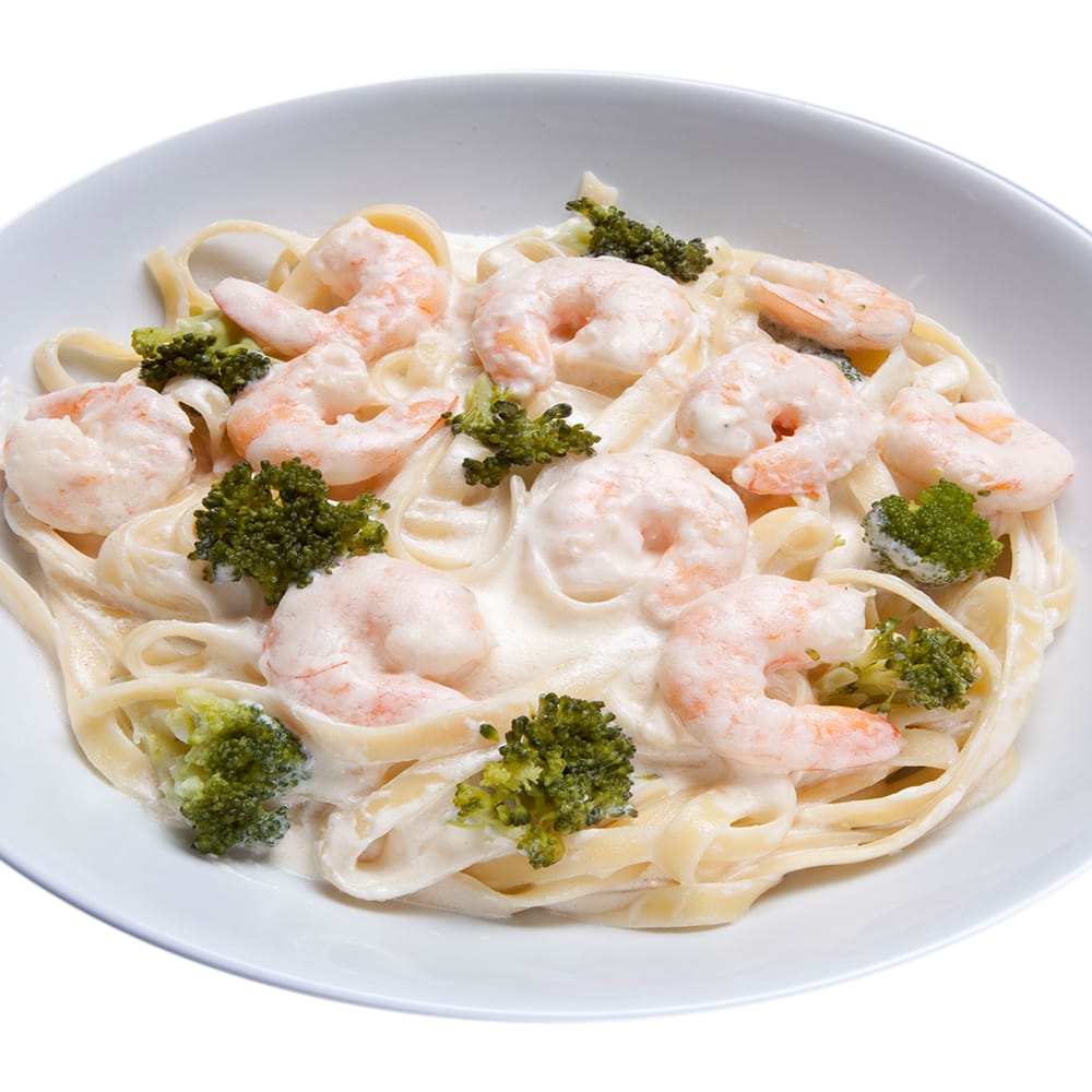 Fettuccine ou espaguete (220g), ao molho branco (bechamel) ou tomate (pomodoro), com camarão (100g), servido com brócolis por cima.