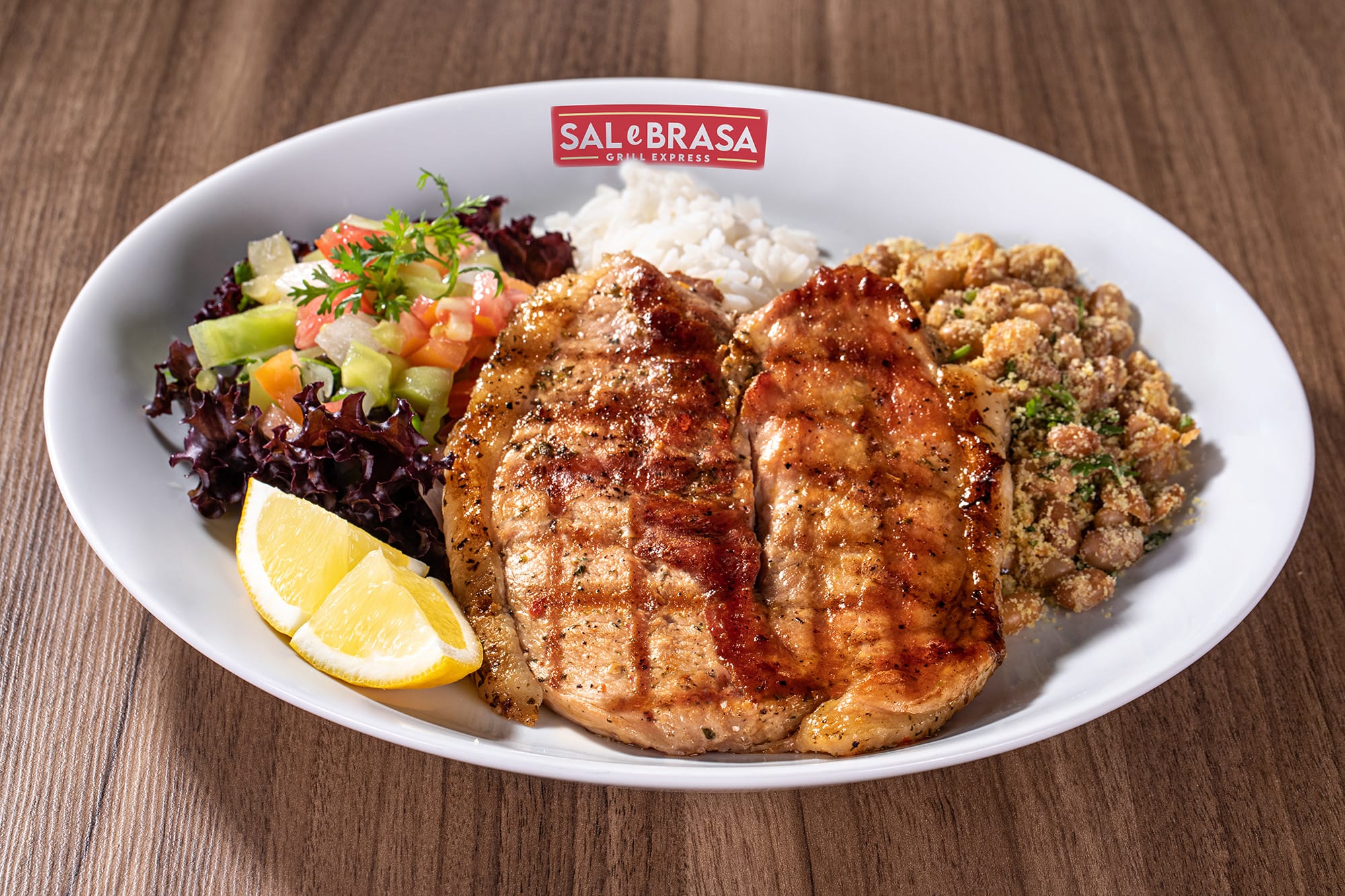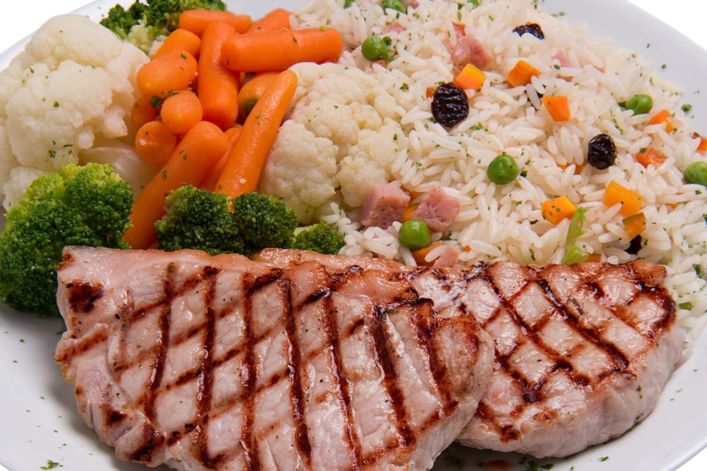 Corte suíno magro, aplicado o tempero Sal e Brasa e grelhado no char broiler.