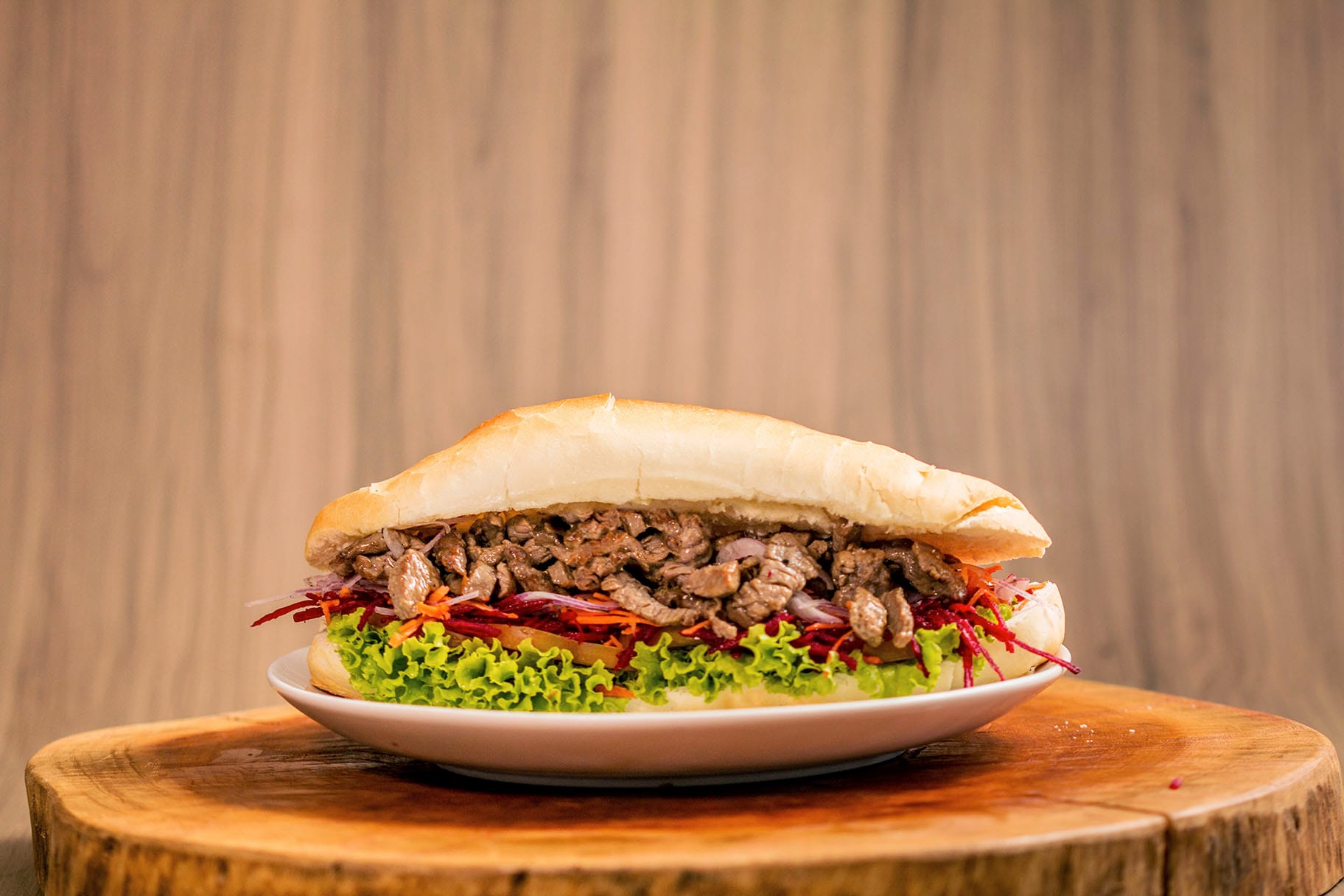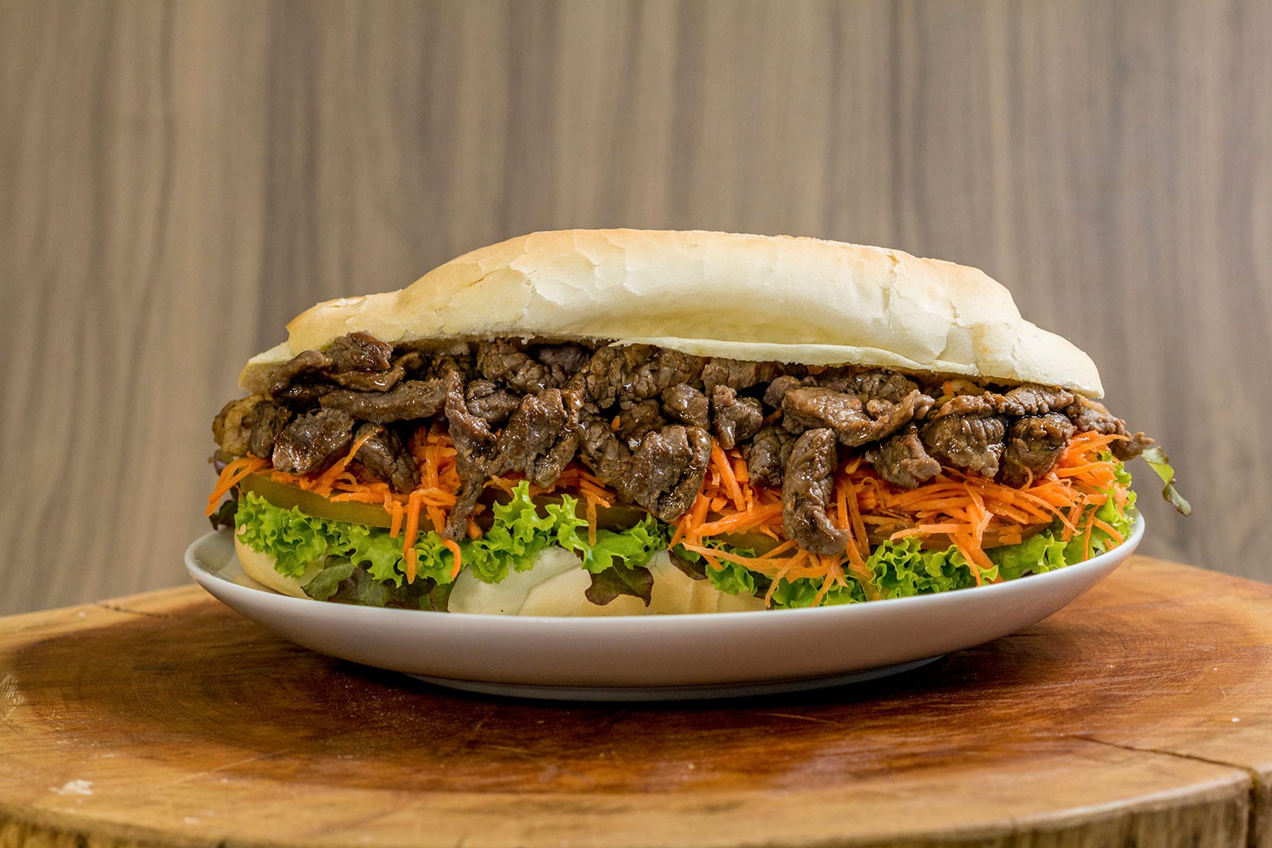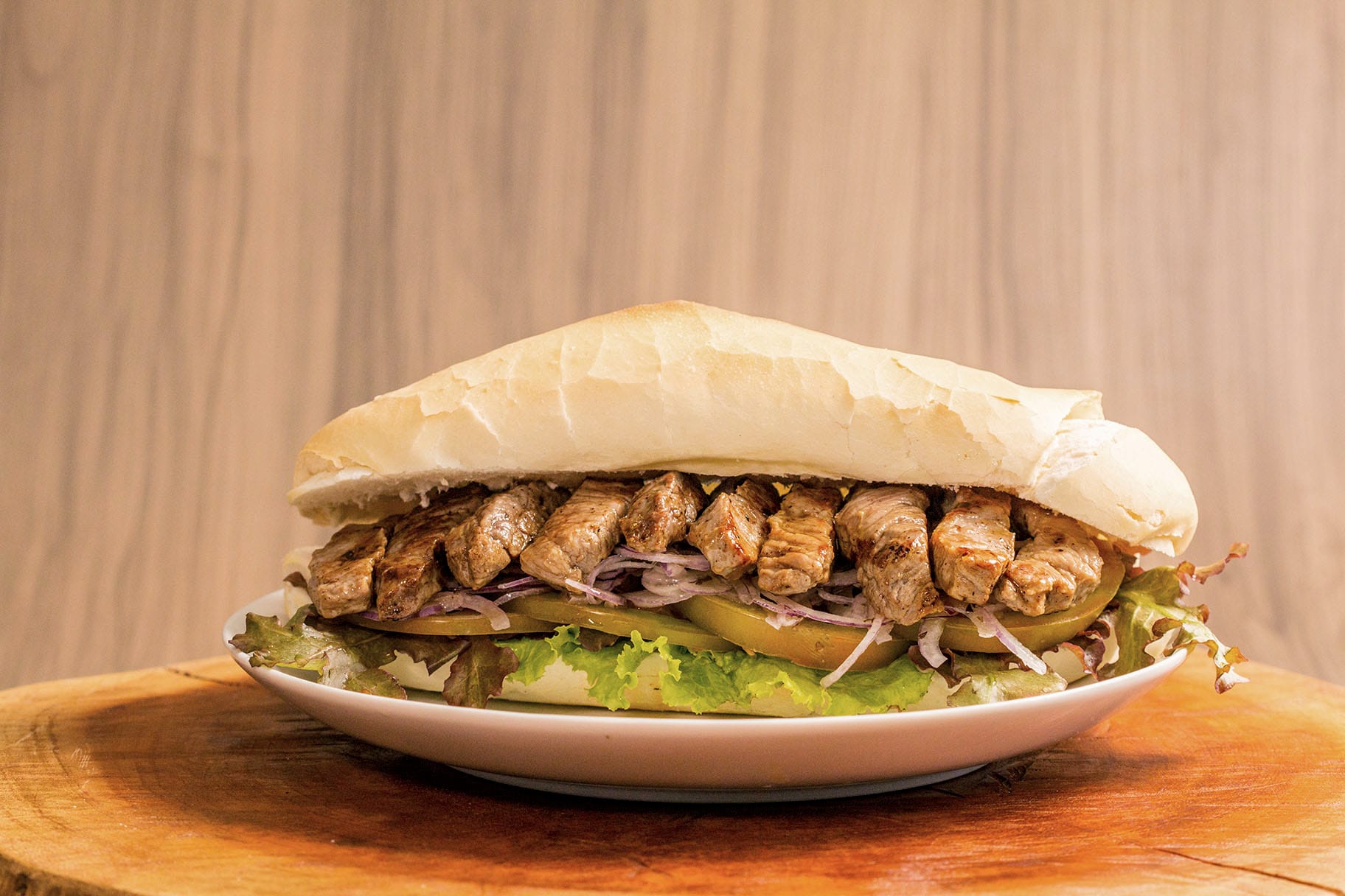 120g de alcatra grelhada em cubos, servida no pão baguete de sal de 20 cm. Acompanha salada, queijo muçarela e dois tipos de molhos à escolha.
