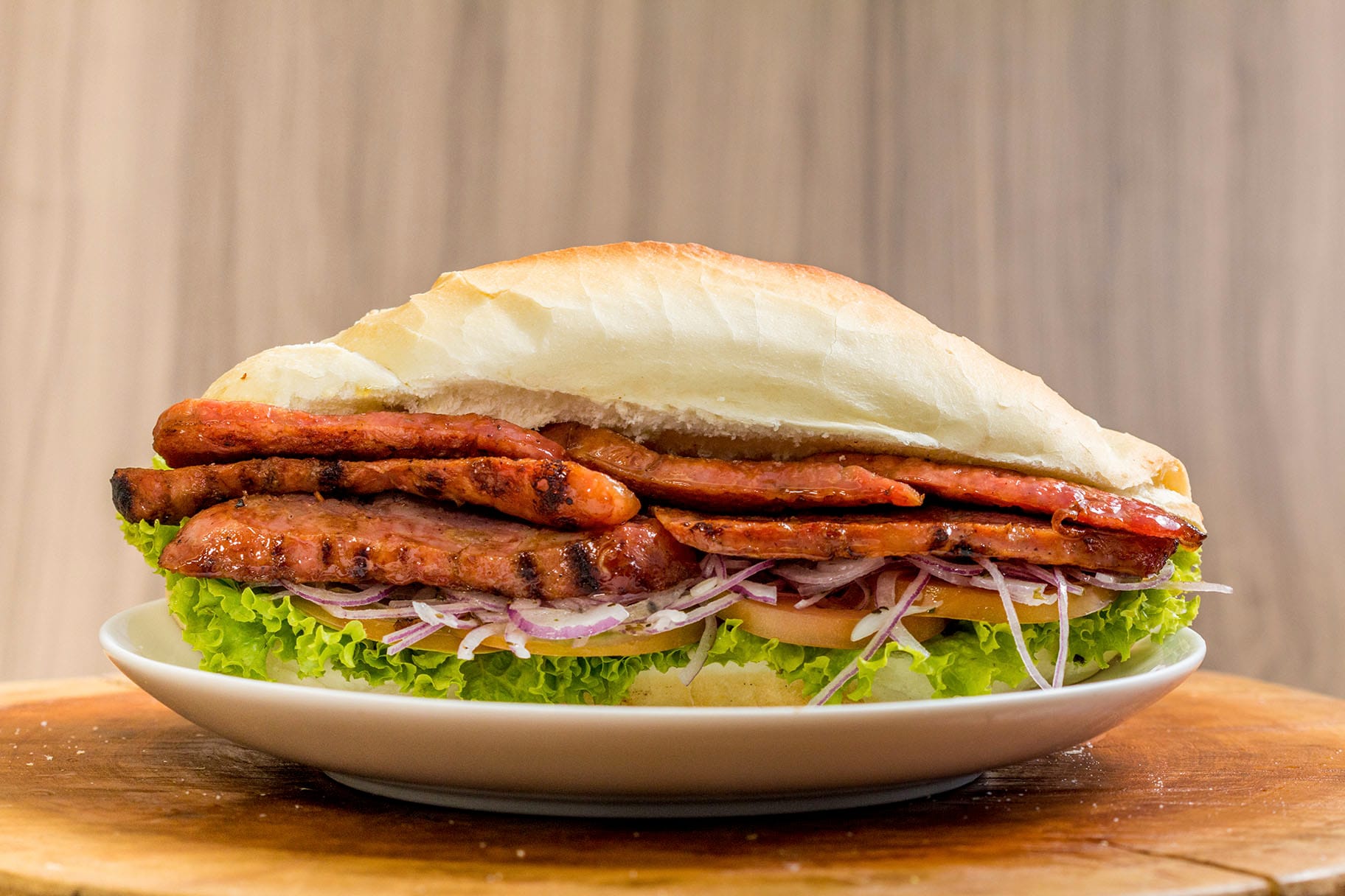 120g de linguiça mista fatiada grelhada, servido no pão baguete de sal de 20 cm. Acompanha salada, queijo muçarela e dois tipos de molhos à escolha.