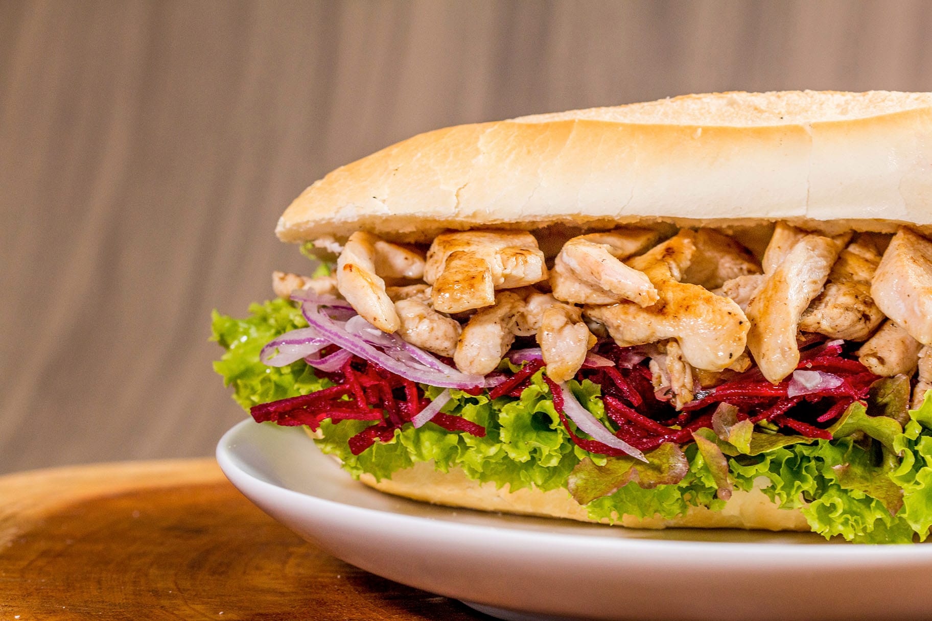120g de filé de peito de frango grelhado em cubos, servido no pão baguete de sal de 20 cm. Acompanha salada, queijo muçarela e dois tipos de molhos à escolha.