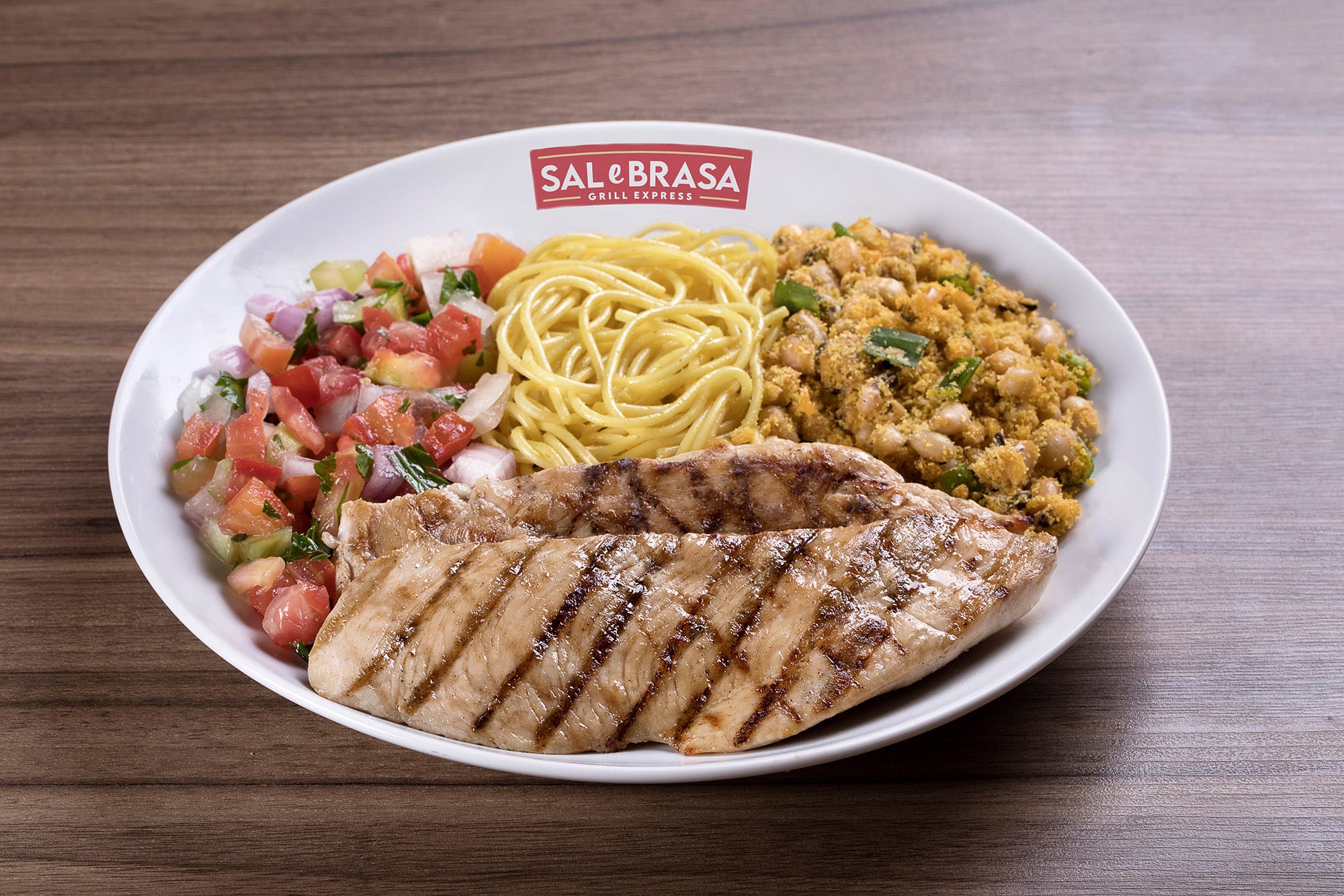 Dois cortes do filé de peito de frango, aplicado o tempero Sal e Brasa e grelhado no char broiler.