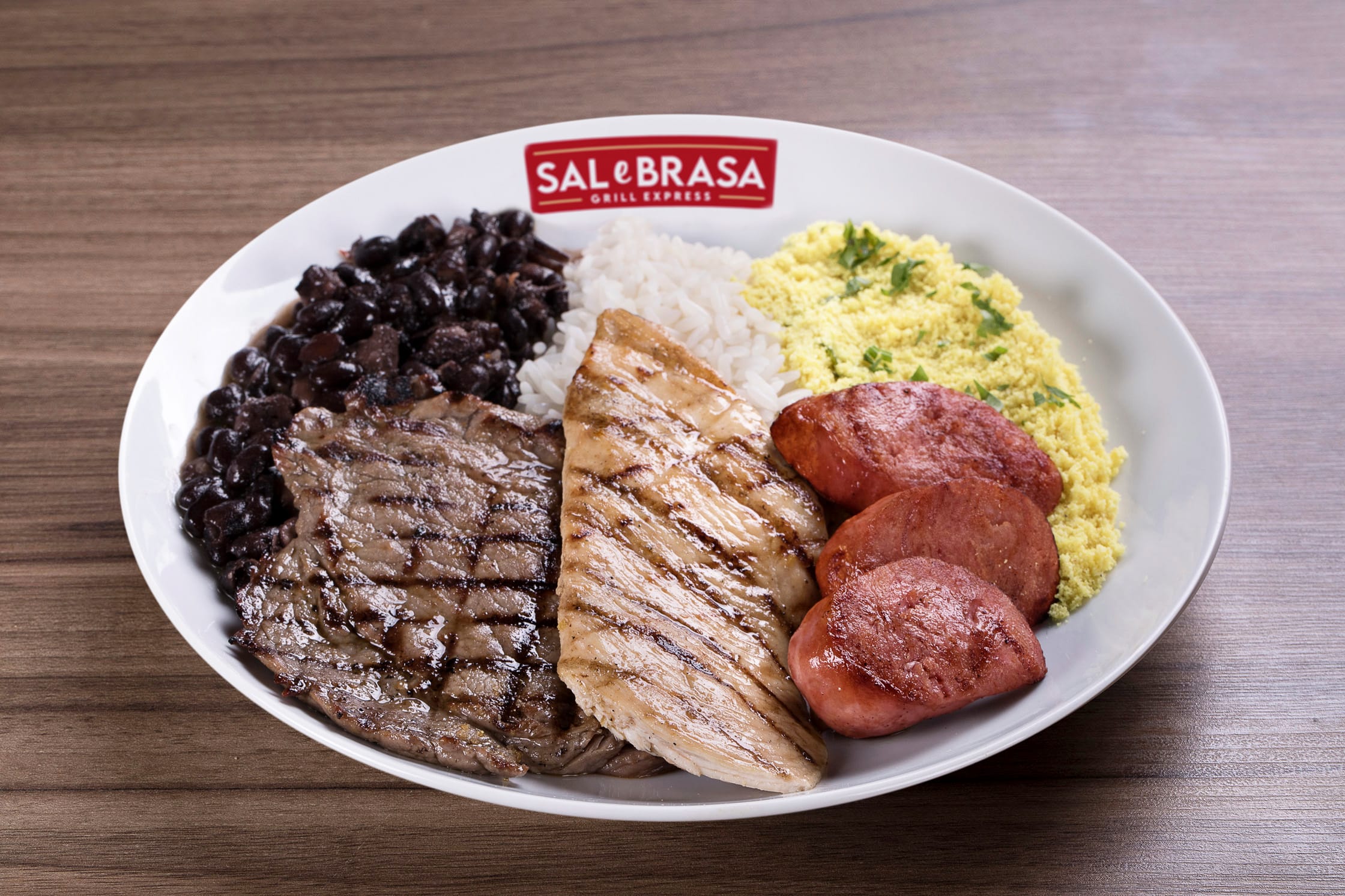 Combinação de três proteínas (carne bovina, frango e toscana), aplicado o tempero Sal e Brasa e grelhado no char broiler.
