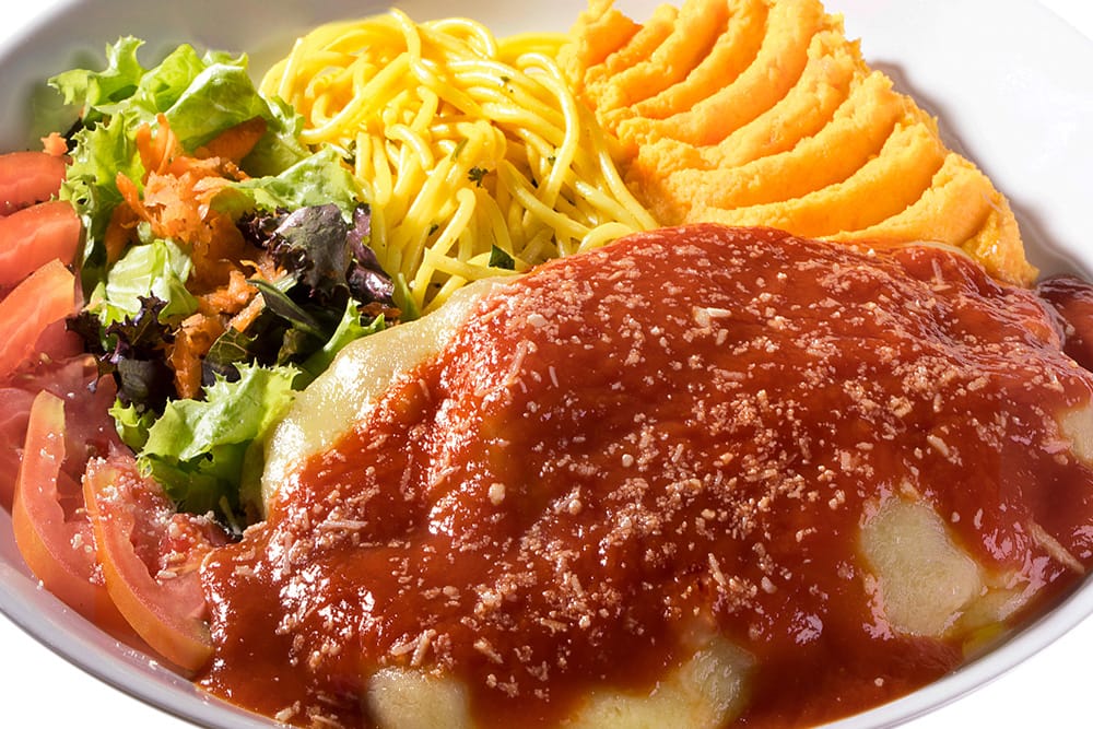 Corte em bife retirado do coxão mole, aplicado o tempero Sal e Brasa, empanado e frito, servido com queijo muçarela e molho de tomate por cima.