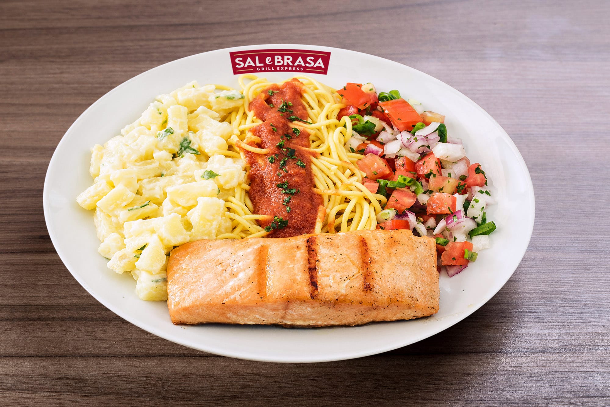 Corte de filé de salmão sem a pele, aplicado o tempero Sal e Brasa e grelhado no char broiler.